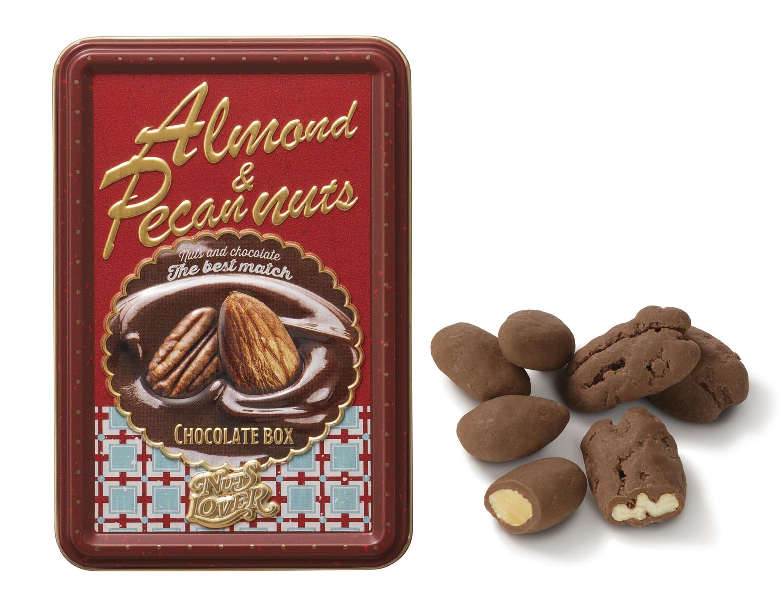 ほんのりとした甘みとコクが後を引くペカンナッツとカリッとしたアーモンドに、まろやかなミルクチョコレートをたっぷりとかけました。味わいの違う2種類のナッツとチョコレートのハーモニーをお楽しみください。手元に置いておきたくなるようなかわいい缶もポイントです。