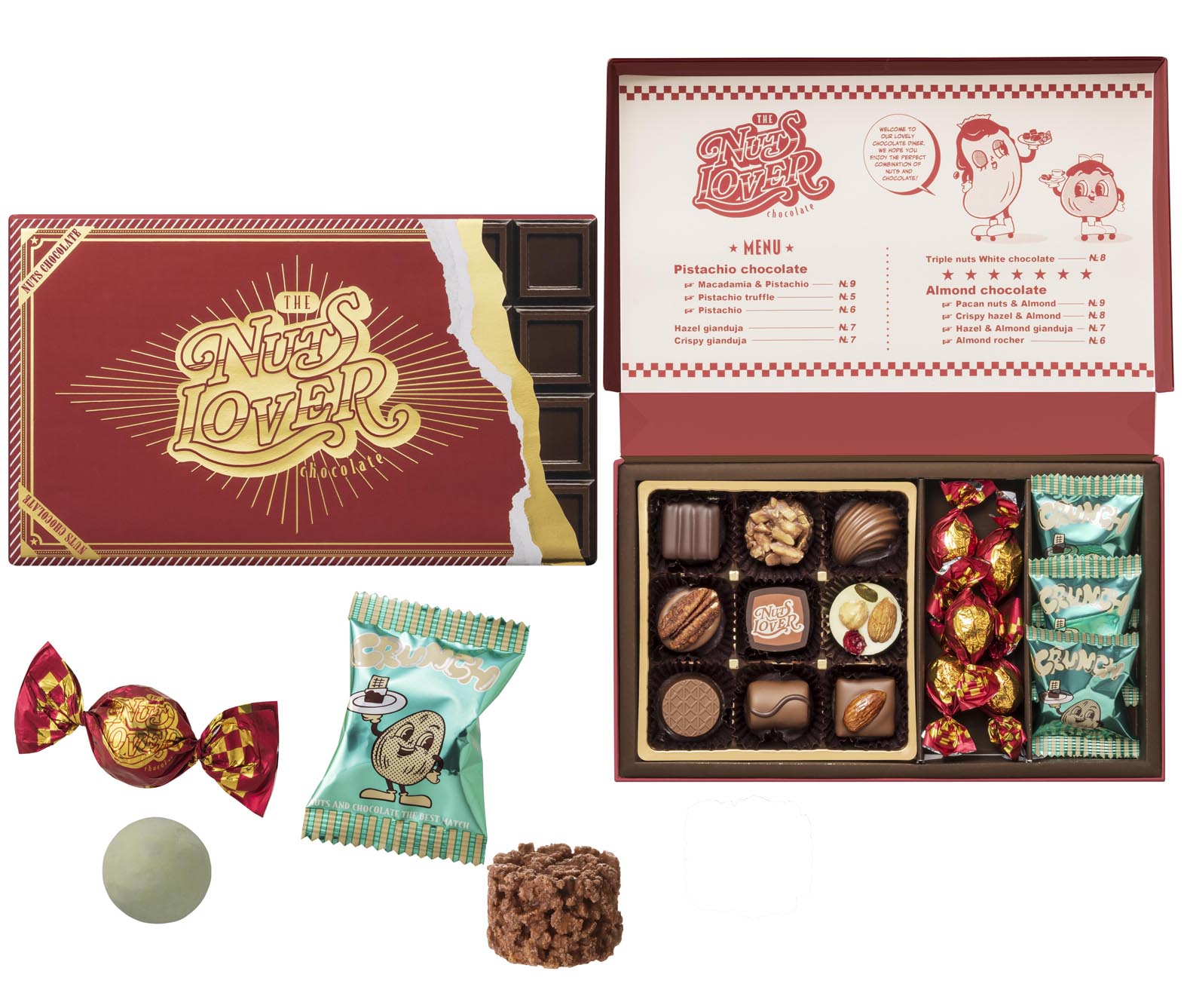 ナッツに特化したチョコレートを堪能できるバレンタイン専用ブランドです。アーモンドやペカンナッツなどいろいろなナッツを組み合わせ、様々な食感で仕立てたチョコレートの美味しさと、オリジナルキャラクターを登場させたポップ感とレトロさのある〈アメリカンレトロ〉の世界観で表現しました。 お好きなナッツ×チョコレートの組み合わせをぜひ見つけてください!
