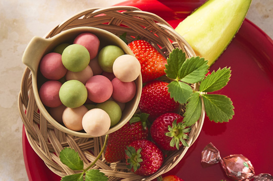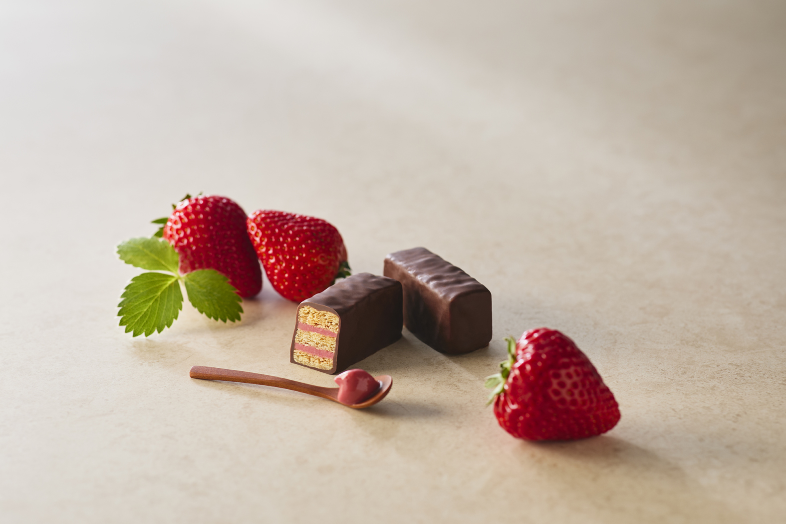苺の酸味も楽しめるように、すっきりとした甘さのスイートチョコレートで包みました。真っ赤な苺が、寒い冬の季節を彩ります。