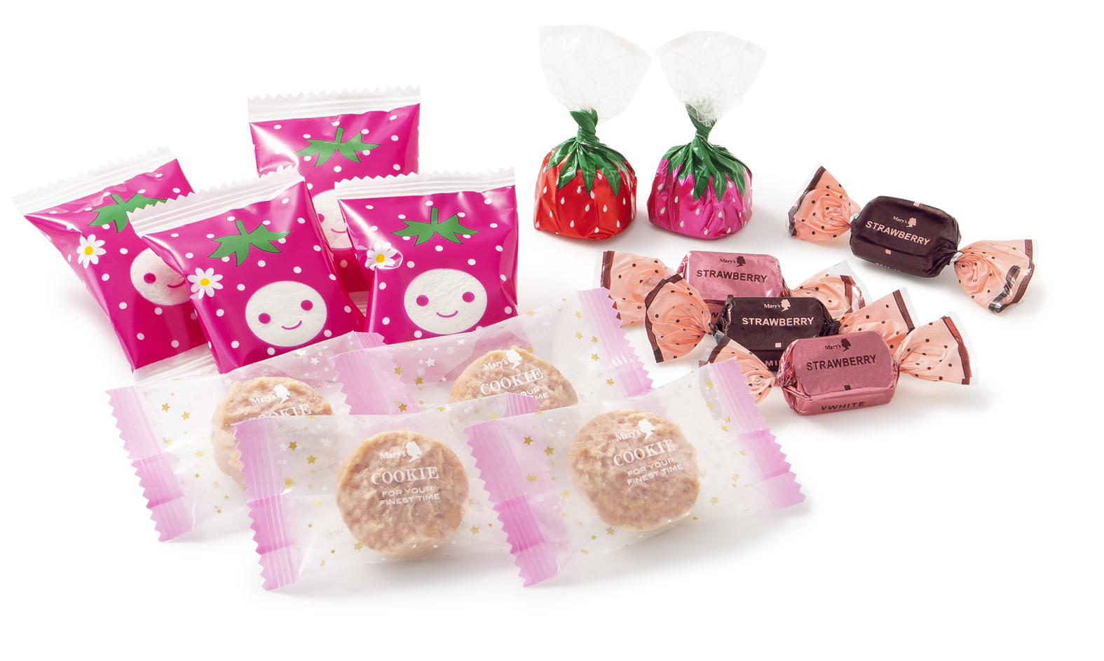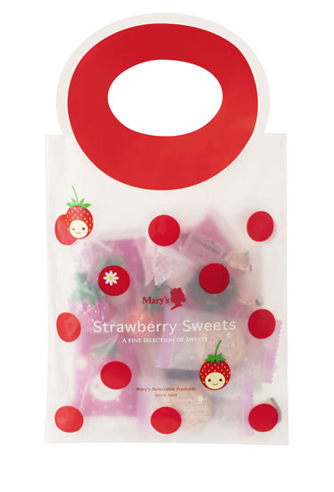 ストロベリーを使ったチョコレート菓子やクッキーなどを、かわいらしい袋に詰め合わせた季節商品です。
