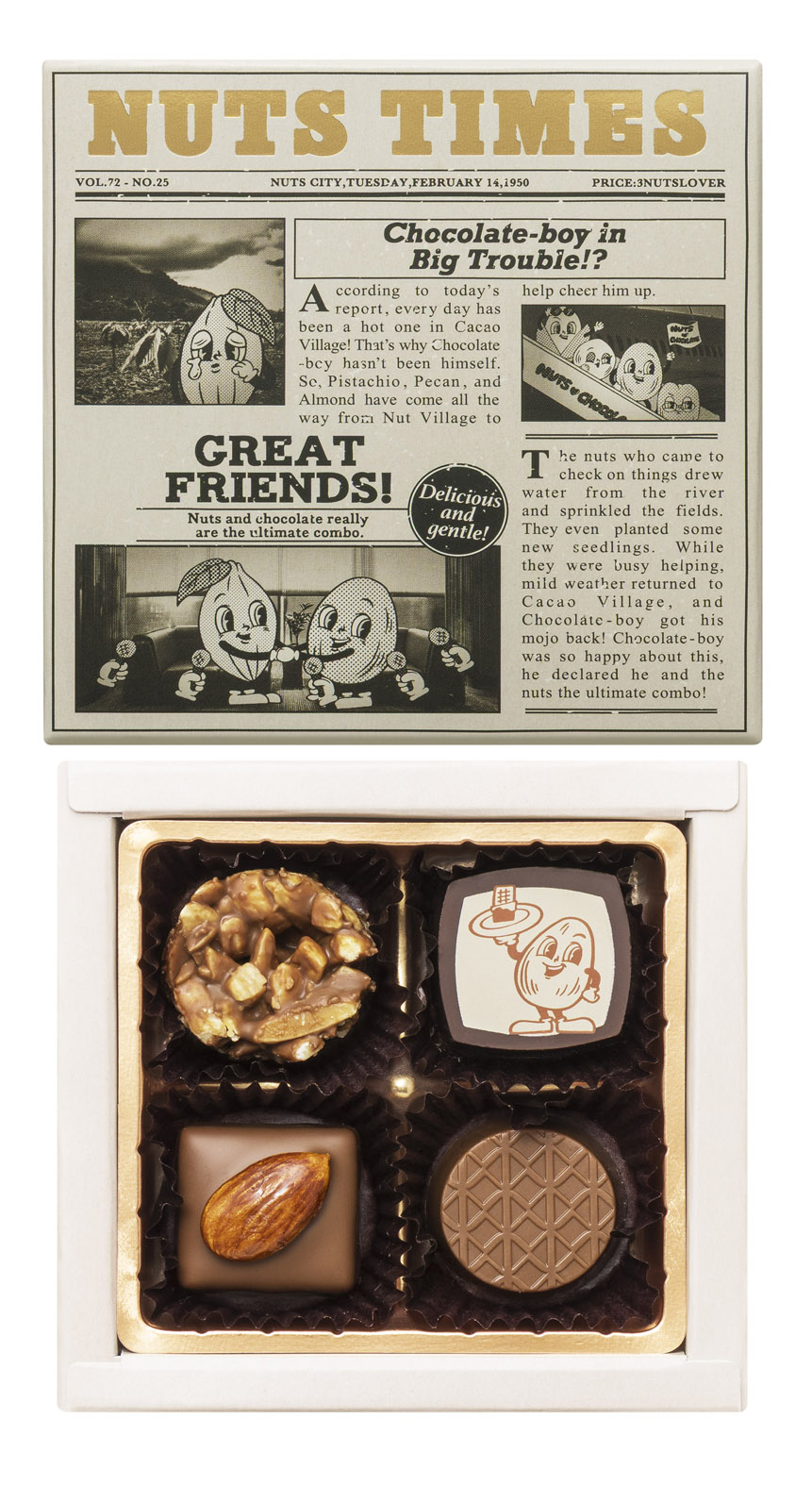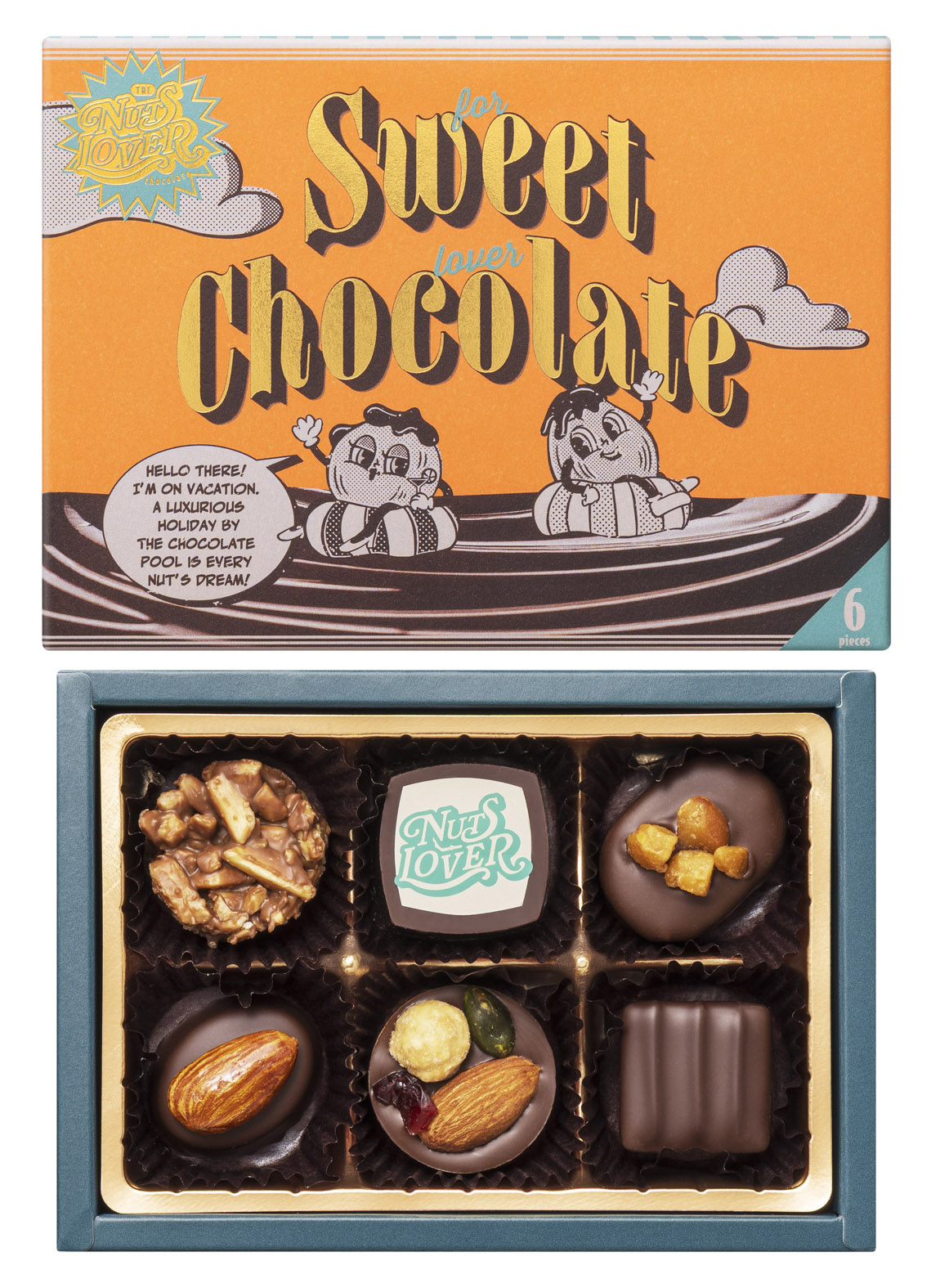 ナッツに特化したチョコレートを堪能できるバレンタイン専用ブランドです。アーモンドやペカンナッツなどいろいろなナッツを組み合わせ、様々な食感で仕立てたチョコレートの美味しさと、オリジナルキャラクターを登場させたポップ感とレトロさのある〈アメリカンレトロ〉の世界観で表現しました。 お好きなナッツ×チョコレートの組み合わせをぜひ見つけてください!